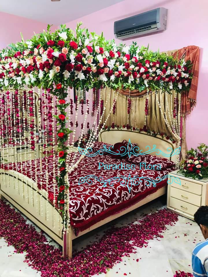 Transform your bedroom into a romantic haven with our Enchanted Flower Canopy Bed Decor. This luxurious setup features a canopy adorned with white drapes and lace fabric, creating an elegant and serene atmosphere. The bedspread and pillows, decorated with delicate patterns and small flower accents, add a touch of charm. Behind the bed, a large arrangement of pink and white flowers brings a splash of color and freshness. Perfect for weddings, anniversaries, or any special occasion, this decor will create a memorable and intimate setting.