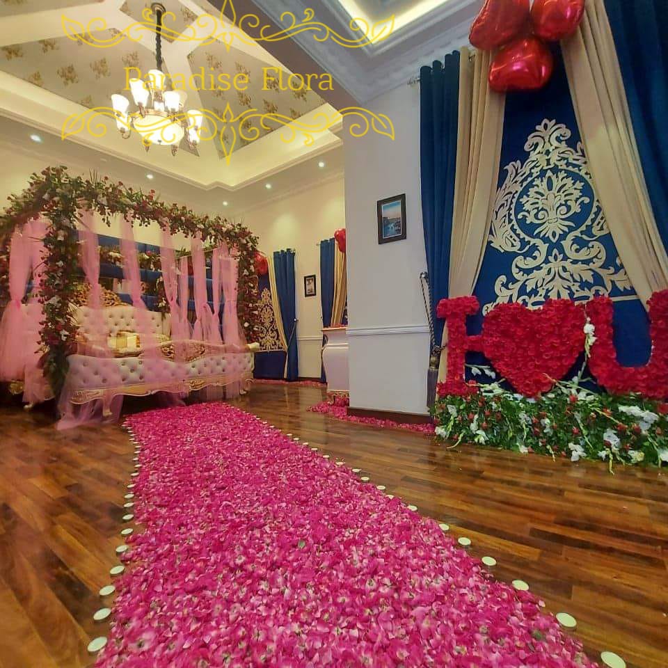 Transform your bedroom into a romantic haven with our Enchanted Flower Canopy Bed Decor. This luxurious setup features a canopy adorned with white drapes and lace fabric, creating an elegant and serene atmosphere. The bedspread and pillows, decorated with delicate patterns and small flower accents, add a touch of charm. Behind the bed, a large arrangement of pink and white flowers brings a splash of color and freshness. Perfect for weddings, anniversaries, or any special occasion, this decor will create a memorable and intimate setting.