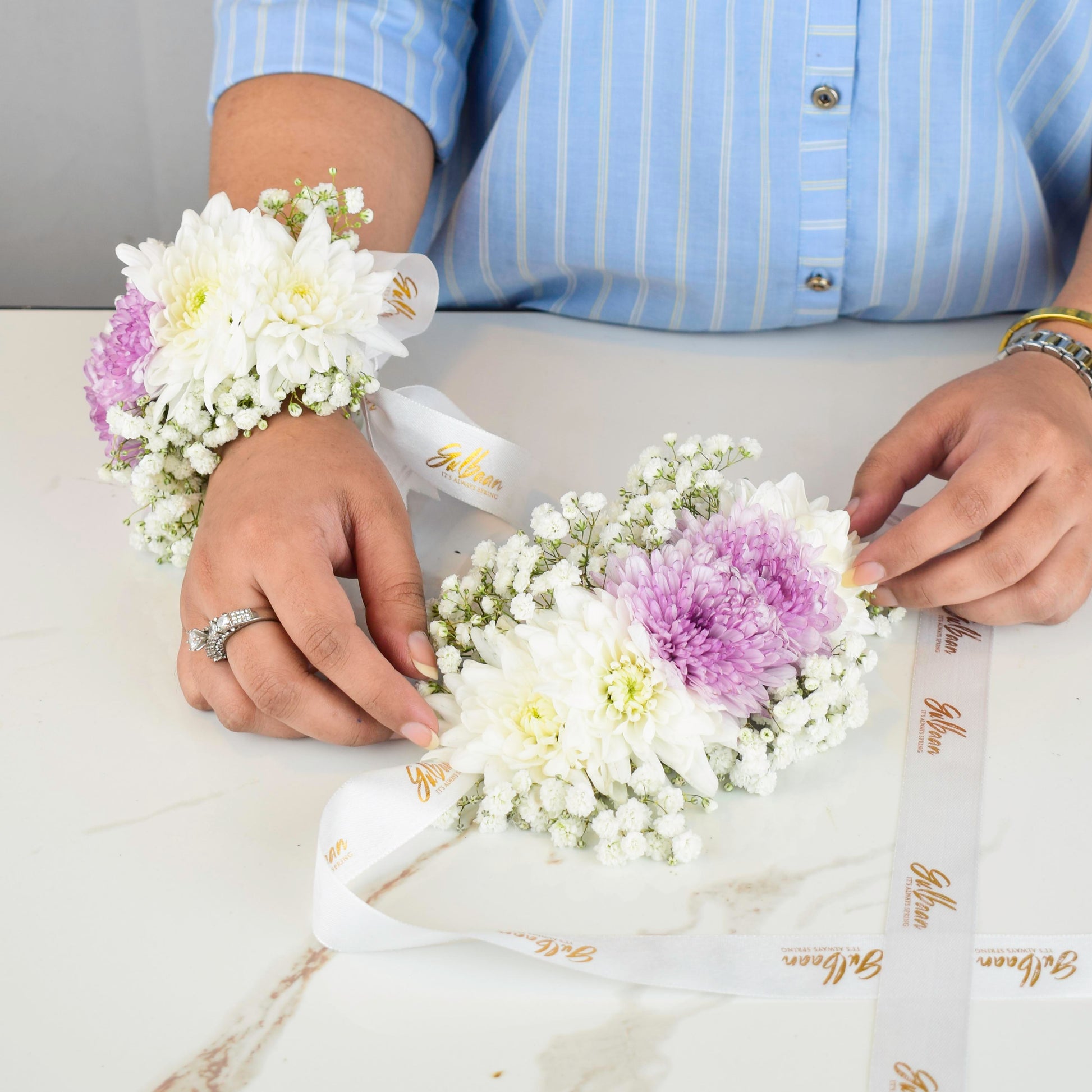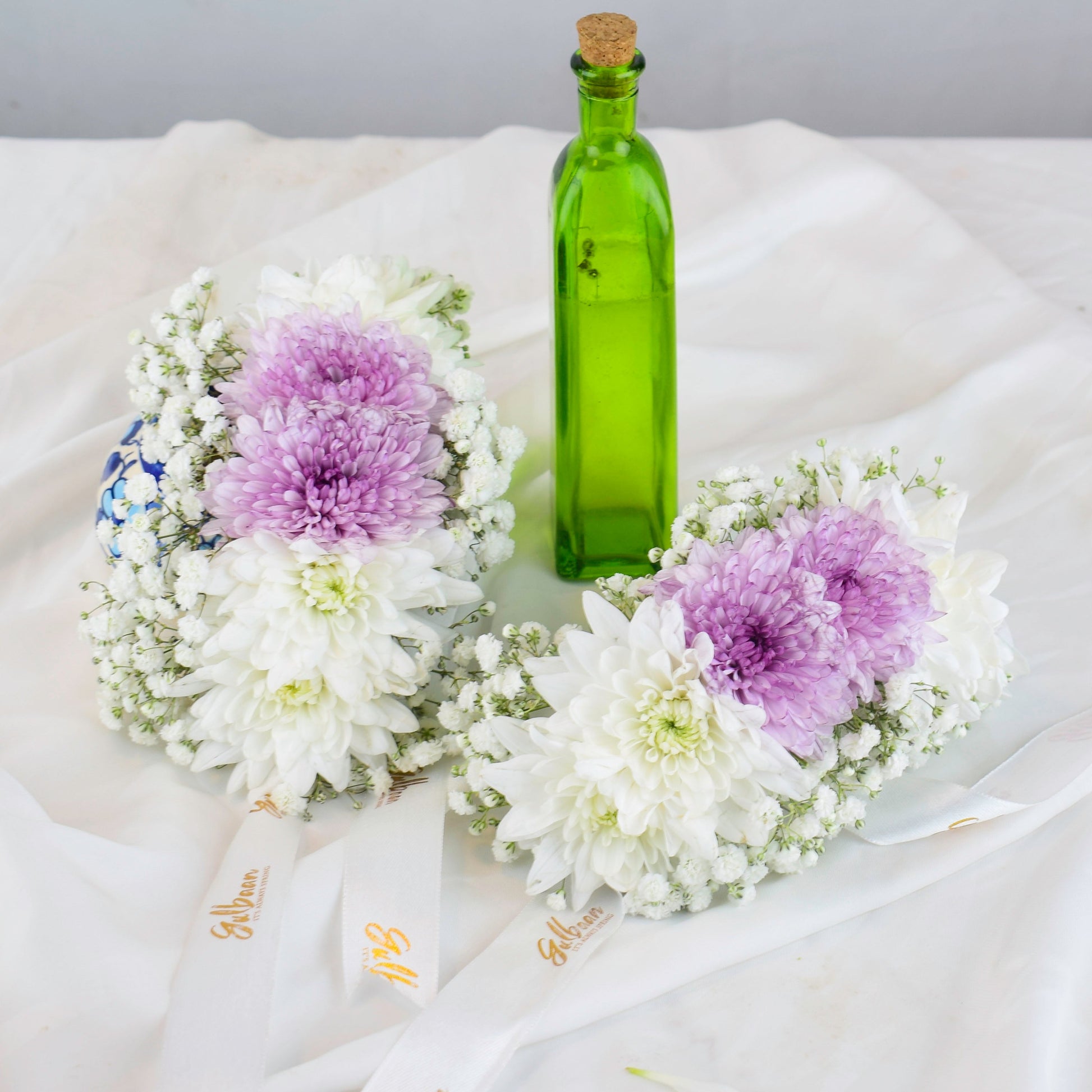 This exquisite gajra pair boasts an elegant arrangement of serene-white and purple Chrysanthemums, perfectly paired with Gypsophila, providing a perfect pop of color to your outfit on your special occasion.