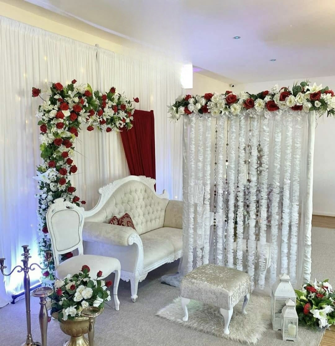 Nikah event with this luxurious floral stage setup, featuring a white canopy draped elegantly with soft fabric and adorned with a lush arrangement of white roses and greenery. The backdrop shimmers with delicate hanging floral strands and warm lighting, creating a magical and serene atmosphere. Ideal for both indoor and outdoor ceremonies, this beautifully designed stage brings elegance, style, and grace to your special day, making it a perfect choice for a memorable Nikah celebration.