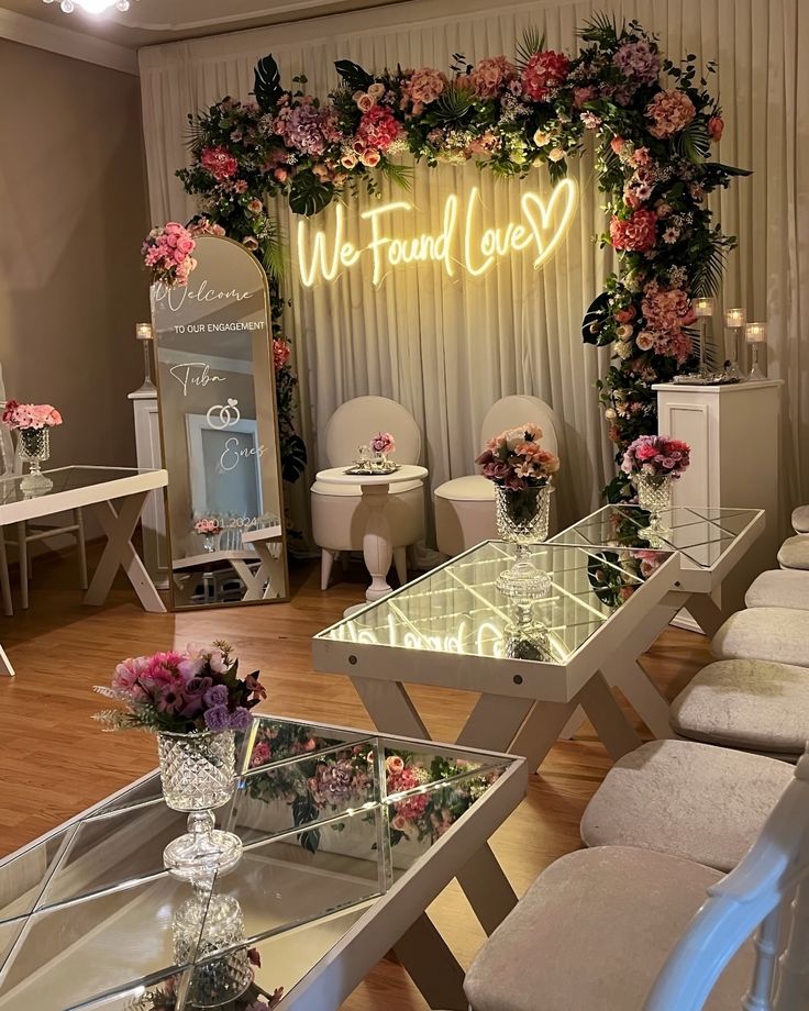 Nikah event with this luxurious floral stage setup, featuring a white canopy draped elegantly with soft fabric and adorned with a lush arrangement of white roses and greenery. The backdrop shimmers with delicate hanging floral strands and warm lighting, creating a magical and serene atmosphere. Ideal for both indoor and outdoor ceremonies, this beautifully designed stage brings elegance, style, and grace to your special day, making it a perfect choice for a memorable Nikah celebration.