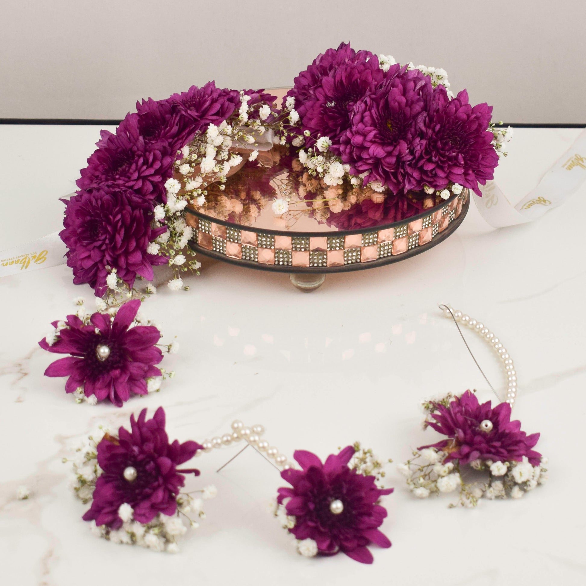 This vibrant and elegant floral jewelry set composed of magenta Chrysanthemums, perfectly complimenting serene-white baby’s breath and lustrous pearls is the ideal choice for your special day.