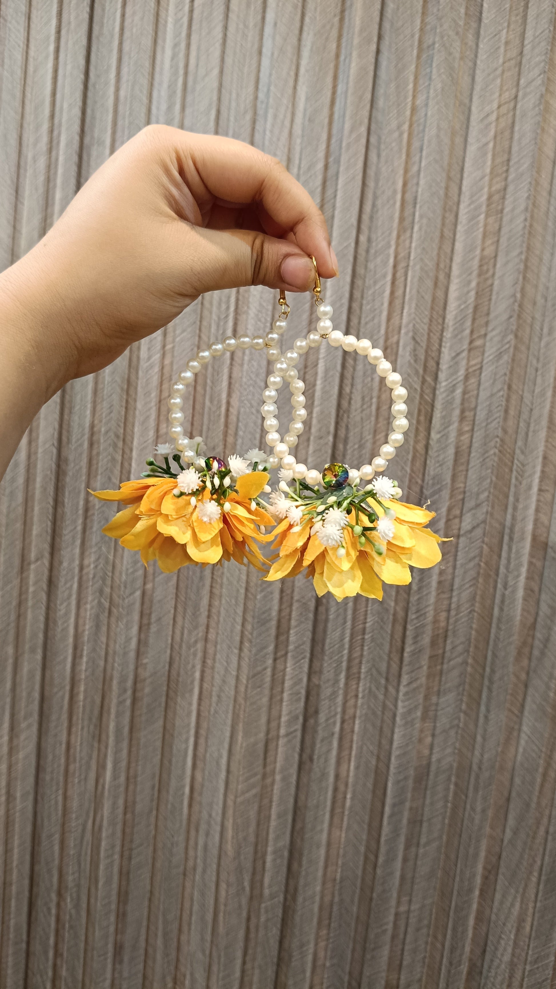 Marigold Yellow Floral Hoop Earrings with Pearl Detailing