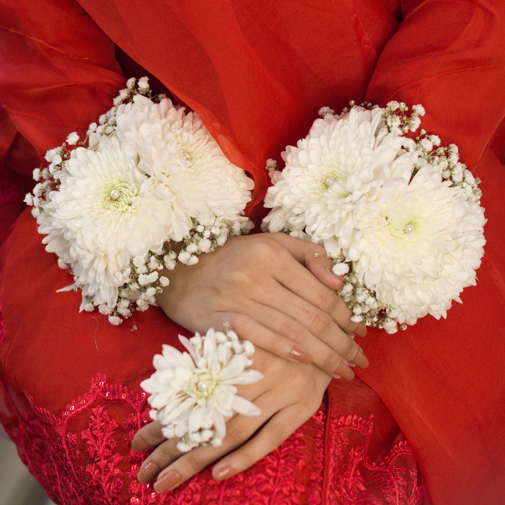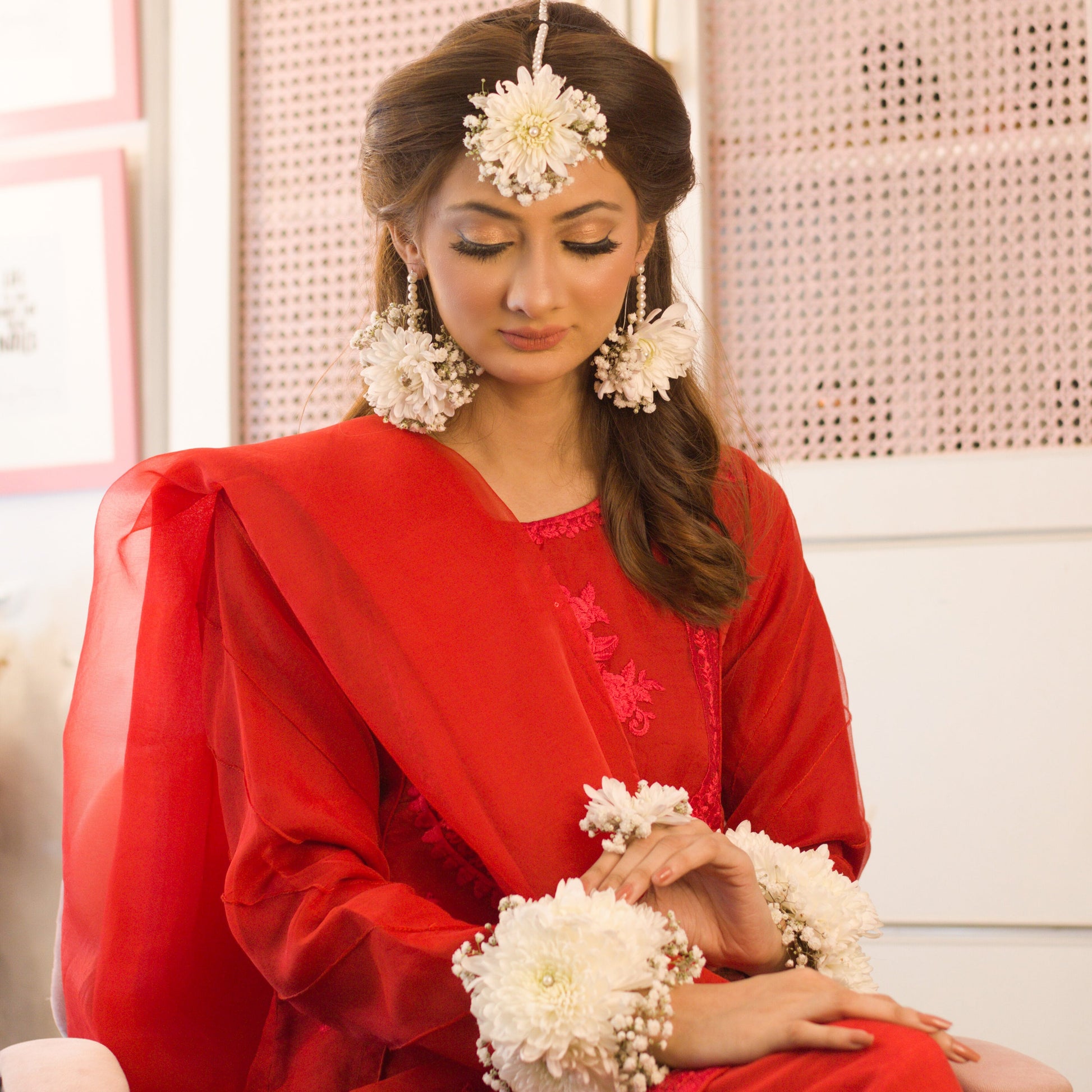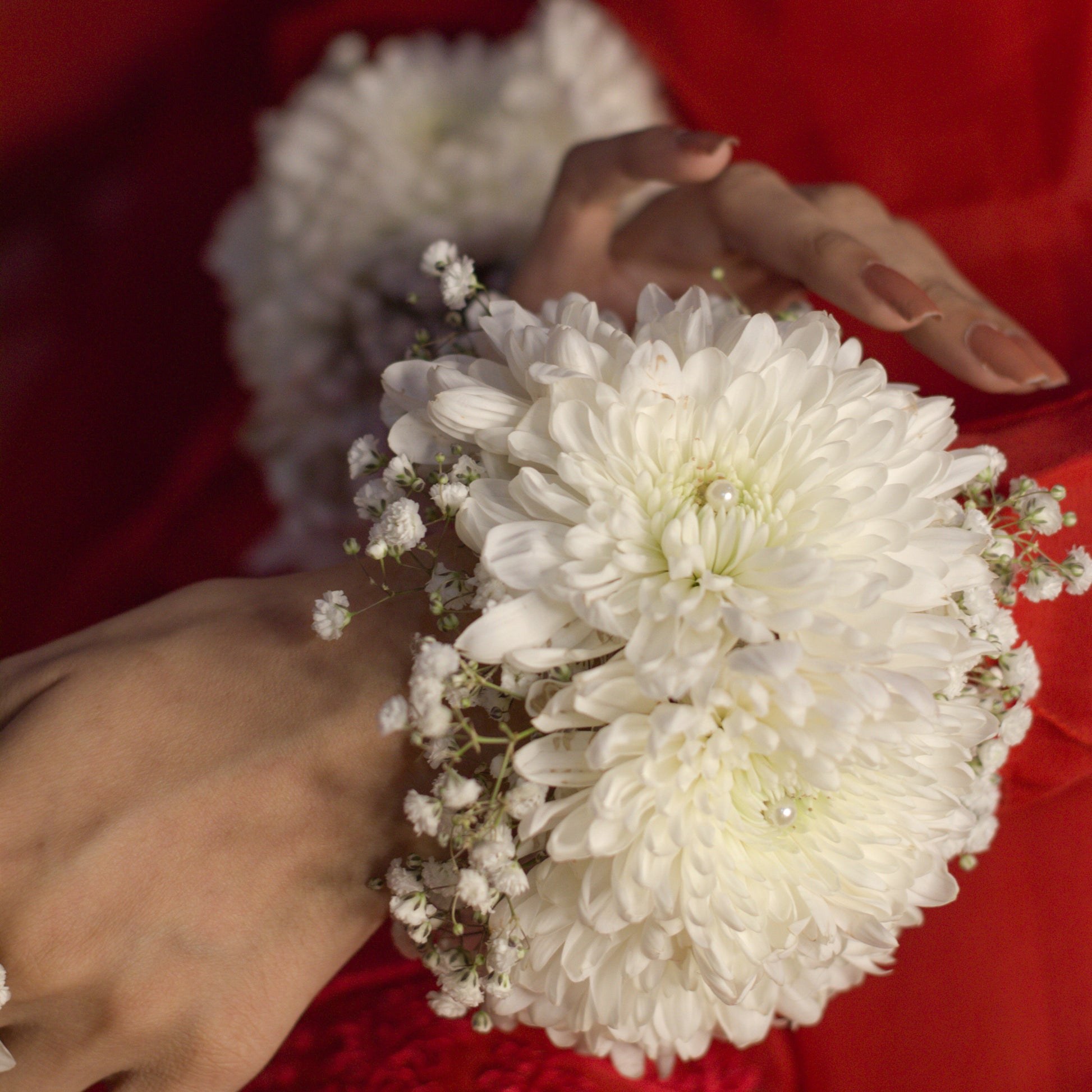 This vibrant and elegant floral jewelry set composed of white Chrysanthemums, perfectly complimenting serene-white baby’s breath and lustrous pearls is the ideal choice for your special day.