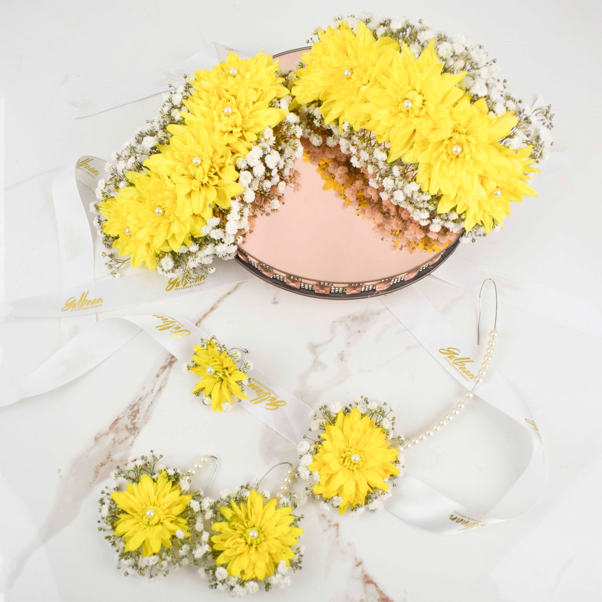 This vibrant and elegant floral jewelry set composed of yellow Chrysanthemums, perfectly complimenting serene-white baby’s breath and lustrous pearls is the ideal choice for your special day.