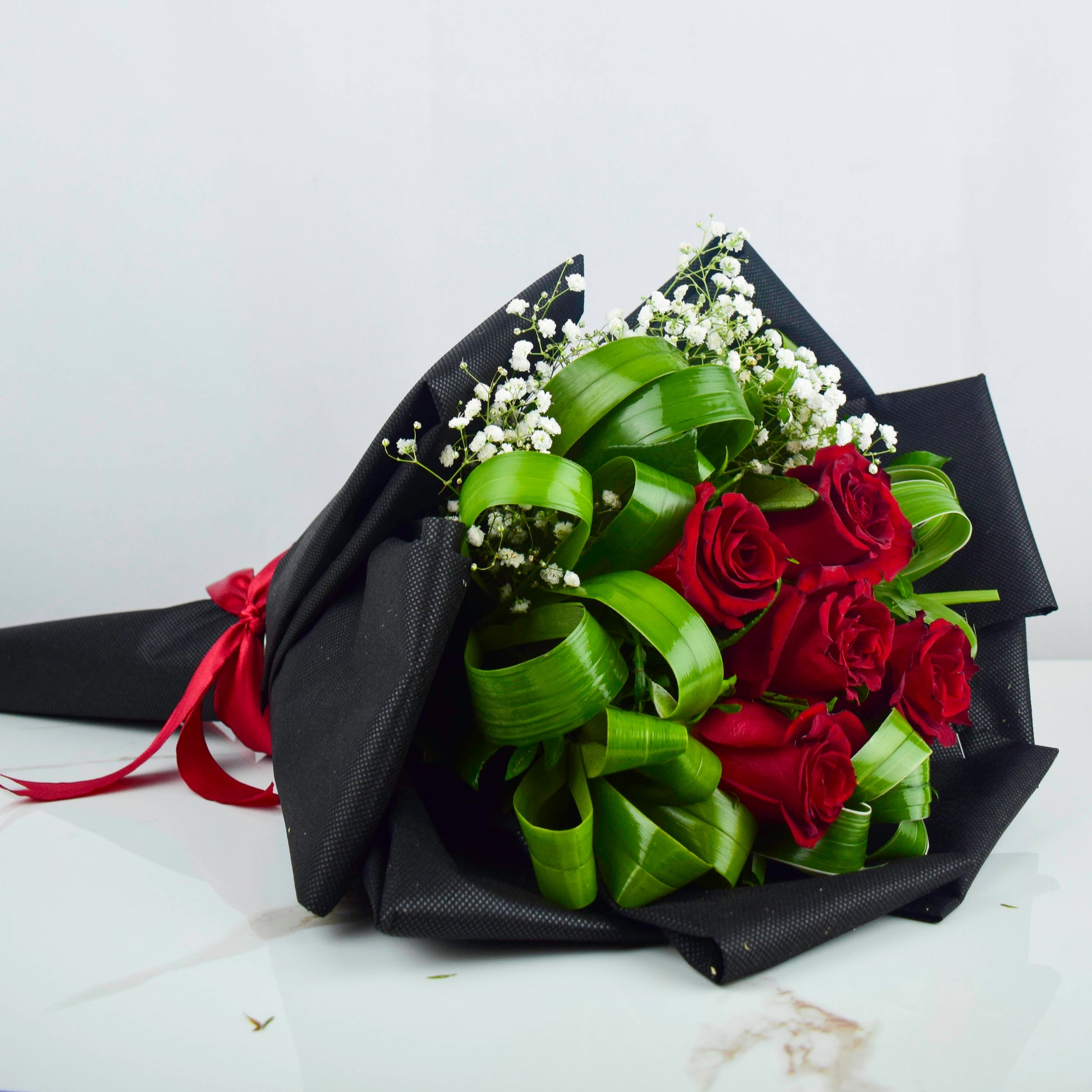 This regal bouquet with mahogany-red Roses is perfectly balanced with serene white Gypso. This artisanal bouquet is a delight with its beauty blended with glamour.
